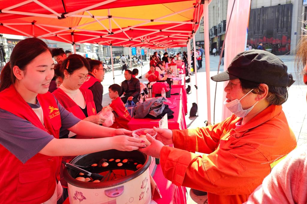 专为环卫工人、外卖小哥等城市“守护者”准备的茶叶蛋,传递了深深的关怀与温暖。张同学与志愿者们默契配合,迅速递送着香气四溢的茶叶蛋。这一举动不仅让城市“守护者”们感受到了社会的关爱,也让他们在忙碌的工作中得到了片刻的慰藉。