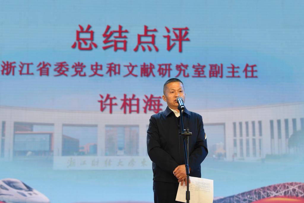 许柏海总结点评,他对现场的精彩演出给予了高度评价,并指出本次红色故事会不仅让人体会到红色政权与美好生活的来之不易,激励着大家奋勇前行,其活动形式更是新颖独特,内容精彩震撼,做到了情景交融,所讲述的故事亲切可感,传递出强大的信仰力量,犹如一堂行走的思政课,深入诠释了老一辈共产党人的情怀以及浙江人民的奋斗精神。