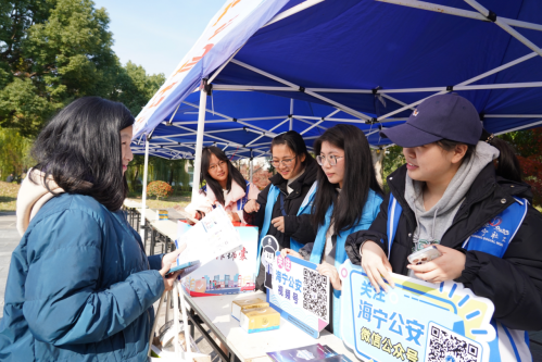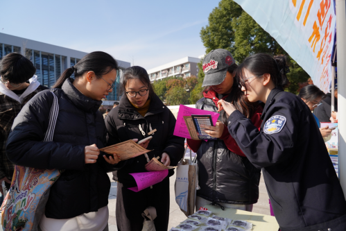 12月17日,由学院安保部和法社学院共同主办的反诈主题“平安集市”活动在一食堂小广场成功举办。此次活动由海宁市公安局、长安镇平安办、长安派出所和斜桥镇手掌心公益组织的工作人员进行系列反诈安全宣传活动,旨在提升校园安全防范意识,筑牢校园反诈防线,以实际行动践行“平安校园”建设理念。活动现场设置了多个活动展位,通过丰富多样的活动形式,为广大师生带来了一场反诈知识盛宴。