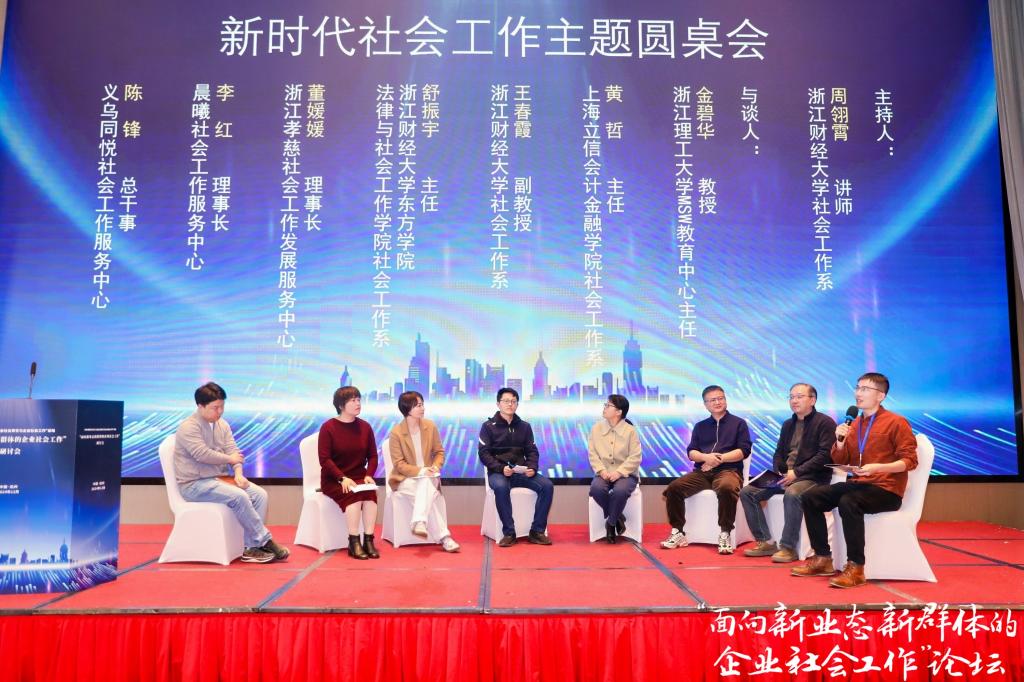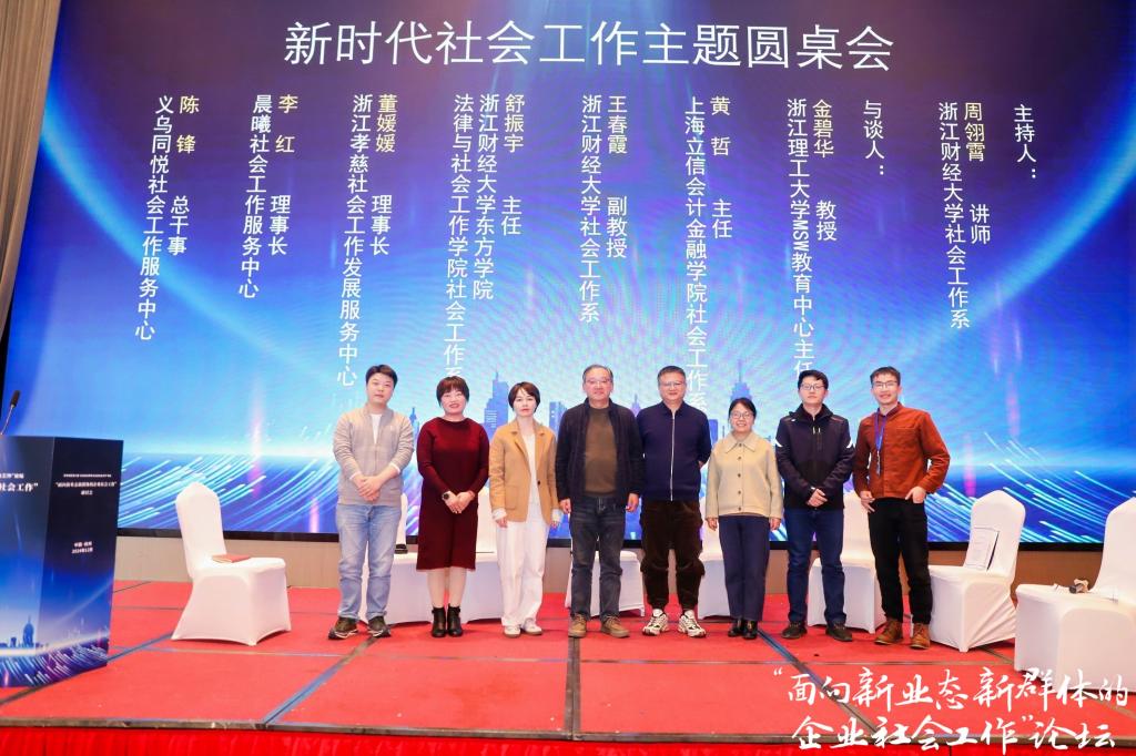 12月8日,我院社会工作系舒振宇、石卷苗、郭美晨三位老师受邀参加华东地区第六届“企业社会责任与企业社会工作”论坛暨“面向新业态新群体的企业社会工作”研讨会,社会工作系主任舒振宇老师在新时代社会工作主题圆桌会议上发言。论坛由浙江财经大学、中国社会工作教育协会企业社会工作专委会、浙江省社会学会主办,来自学界业界的代表们针对“企业社会责任”“企业社会工作”“新时代社会工作”“两企”、“三新”与“企业创新”等议题做交流分享。