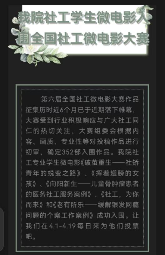 按照全国社工微电影大赛的比赛流程,经过了作品初审之后,我院5支团队全部入围,便通过官方微信公众号“东方社工人”开始网络投票。在社工协会的支持下,于2024年4月1日至4月19日进行全校范围的拉票。之后经历漫长的专家评审,2024年9月2日,社工微电影大赛入围名单正式发布,我院五只团队的作品获得提名奖。