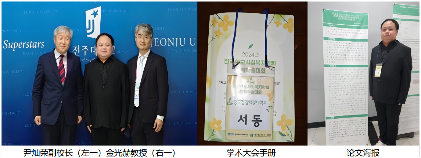 另据悉,本次第56届韩国学校社会福利学会学术大会是在韩国全北特别自治道、韩国教育部、韩国儿童福利协会、Good Neighbors(全球儿童权利专门非政府组织)、Save the Children(全球最大儿童独立慈善组织)的支援下,包括韩国学校社会福利学会在内12个专门学会和相关机构参加的韩国学校社会福利领域最大规模的学术活动。今年的大会主题为“学校社会福利(教育福利)和学生量身定制综合支援”。同时这也是我校法律和社会工作学院社会工作系徐冬老师继2019年后第六次应邀赴韩进行学术交流,与韩国社会福利企划、官产学合作、国际交流、专门学会等领域的包括韩国社会福利学会、韩国产业技术振兴协会等多个学术组织与全州大学尹灿荣、金光赫教授、韩国全国大学事务、总务、管理、财务处(局)长协议会文龙元教授、韩国产业技术振兴协会丁起昌教授等一批学界知名专家建立了广泛、深入的合作关系。会议期间,作为韩国农村振兴厅特聘顾问专家徐冬老师还受邀到访了江原特别自治道,在道厅受到金起河议长的亲切接见,并参访了江原国家Technopark、 KIST江陵分院、首尔大学GBST等科研院所;在京畿道还先后拜会了全安娜(议政府市)和李恩庚(东豆川市)等多位地方议员,在获邀参加2024东豆川非物质文化节大庆典活动期间受到韩中议员联盟执委、韩国汝矣岛研究院院长金成愿国会议员(副总理)的亲切接见。随后相继参访了议政府、东豆川、平泽等地。