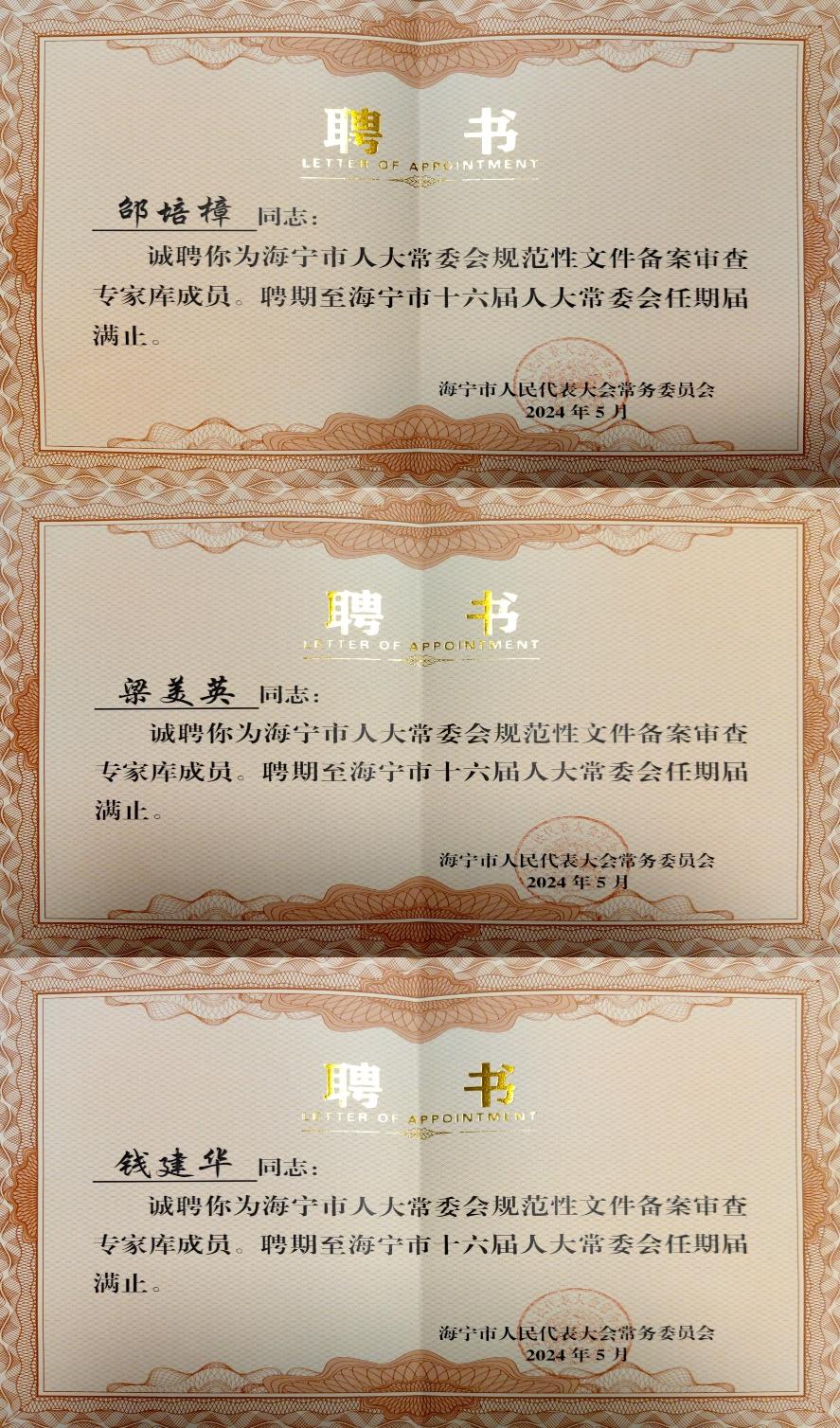 我院于2017年5月成为海宁市人大常委会规范性文件备案审查合作单位,7年间累计审查规范性文件15项。三位教师将以此次受聘为契机,为规范性文件备案审查建良言、献良策,发挥好“智囊”作用,进一步提升规范性文件备案审查的规范化、专业化水平,进一步推进法治海宁建设。(撰稿:梁美英;审核:邵培樟)