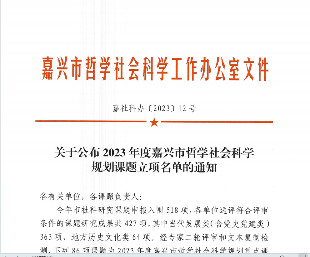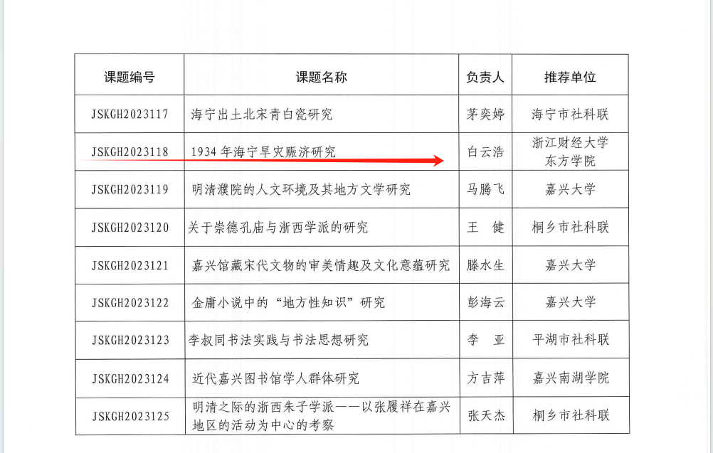 近日,嘉兴市社科联发布了《关于公布2023年度嘉兴市哲学社会科学规划课题立项名单的通知》(嘉社科办〔2023〕12号),我院思想政治理论教研部白云浩老师申报的课题《1934年海宁旱灾赈济研究》(JSKGH2023118)课题获准重点课题立项。