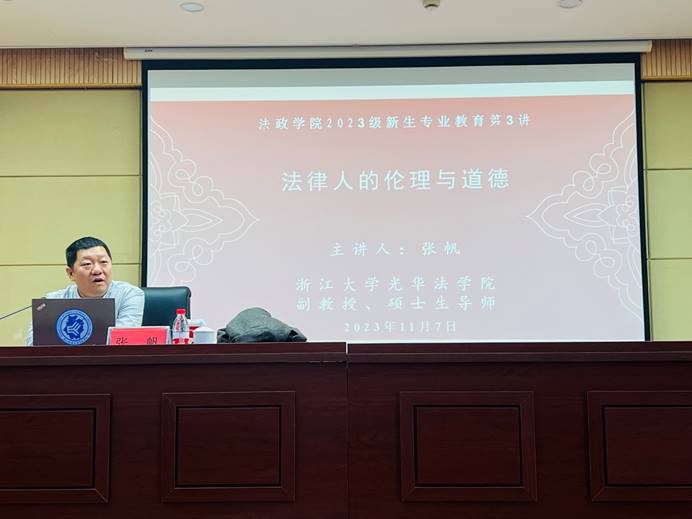 11月7日下午,法政学院诚邀浙江大学光华法学院副教授张帆,为我院新生作“法律人的伦理与道德”主题讲座。本次讲座于学术中心第1报告厅举行,法政学院陈昱老师主持,全体法政学院法学专业学生共同参与。