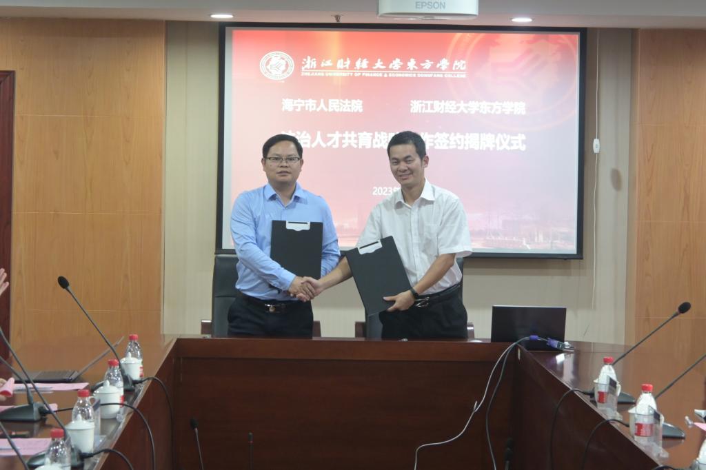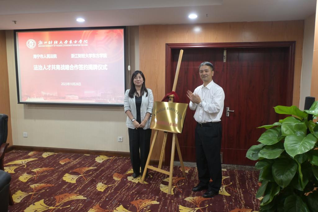 10月26日,学院与海宁市人民法院在学术中心第三会议室举行了海宁市人民法院、伟德victor1946“法治人才共育战略合作”签约揭牌仪式。校党委委员、学院党委书记申屠莉,海宁市人民法院党组书记、院长王建强,学院副院长张伟飚,海宁市人民法院党组成员、政治部主任宋杰,海宁市人民法院长安法庭庭长张辉,海宁市人民法院政治部副主任何素静、海宁市人民法长安法庭副庭长范凤佳,法政学院负责人及师生代表40余人参加仪式。