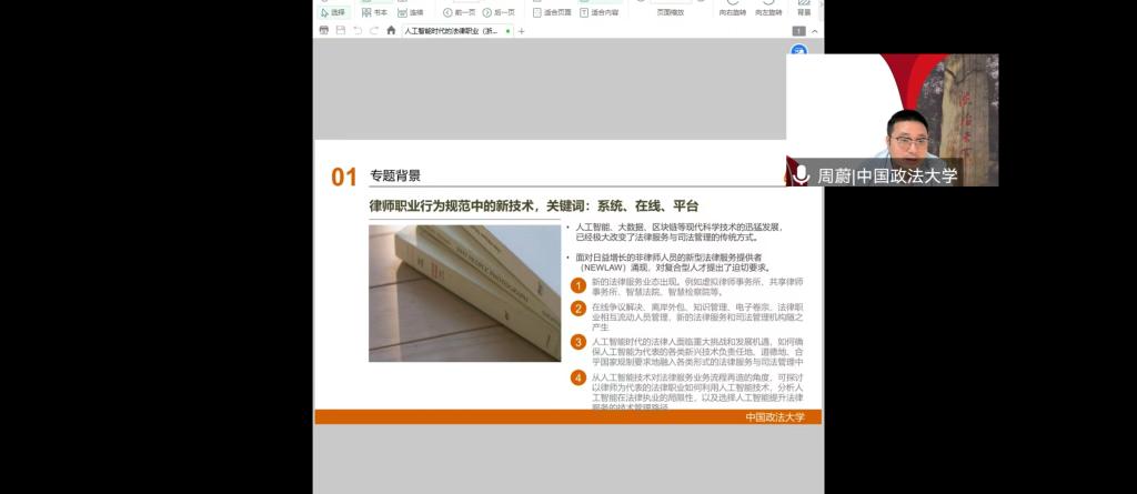 讲座伊始,周教授以 “现状、限度、线路”为关键词,依托现时代背景创造性提出:要从人工智能技术对法律服务业务流程再造的角度,去探讨以律师为代表的法律职业如何利用人工智能技术,分析人工智能在法律执业的局限性,以及选择人工智能提升法律服务的技术管理路径。