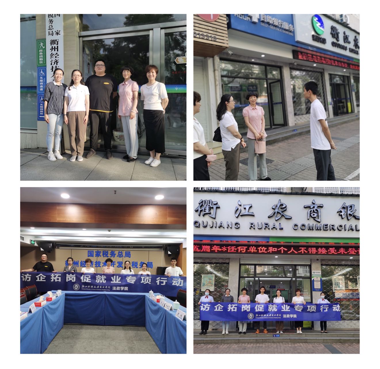 在衢州,学院领导等一行先后走访了在衢州经济技术开发区税务局工作的17届校友许林杰和在衢江农商银行工作的09届校友周寅。两位校友向母校领导老师介绍了自己的工作情况,并带大家参观了工作单位。校友们表示单位对财政专业和法学专业人才的需求量大,欢迎母校学弟学妹报考所在单位。