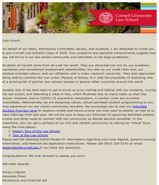 近日,我院2013级法学1班学生祝一诺被康奈尔大学录取为法律博士(JD)研究生,特此祝贺!