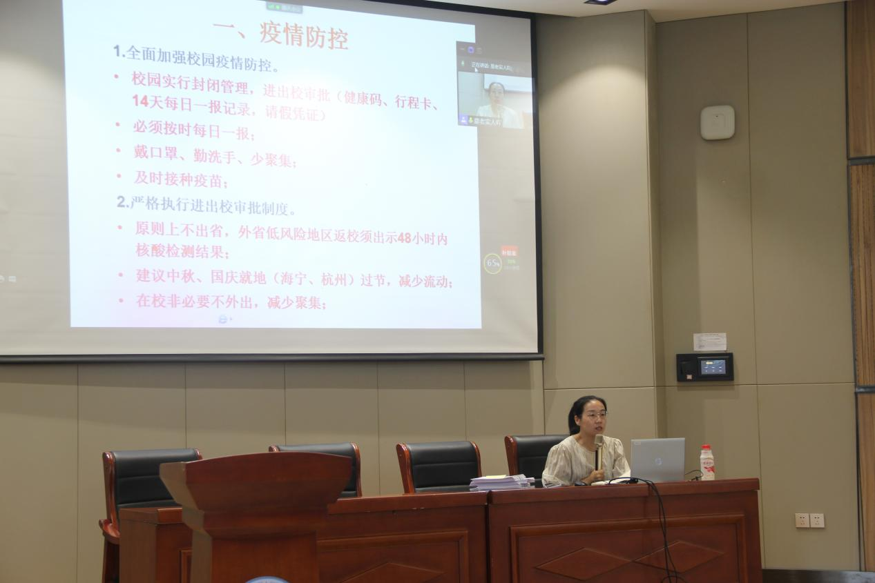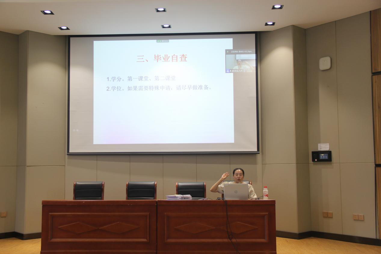 最后一年的校园时光,安全问题仍重于泰山。大会伊始,毕业班辅导员钱璐老师率先强调了校园安全问题,包括疫情防控安全、网络诈骗安全和就业安全。钱老师结合我校疫情防控相关规定,呼吁同学们临近假期原地过节,非必要不外出,减少聚集,从自身做起不给国家社会添麻烦。同时,健康之路打卡是疫情防控的重要措施,同学们仍需提高重视度。钱老师强调了网络诈骗问题,通过发生的现实教训提醒同学们提高警惕,严防诈骗。此外,初入社会,就业安全问题不容小觑,希望同学们可以清楚识别求职陷阱,不贪小便宜,谨慎行事学会用法律保护自己。