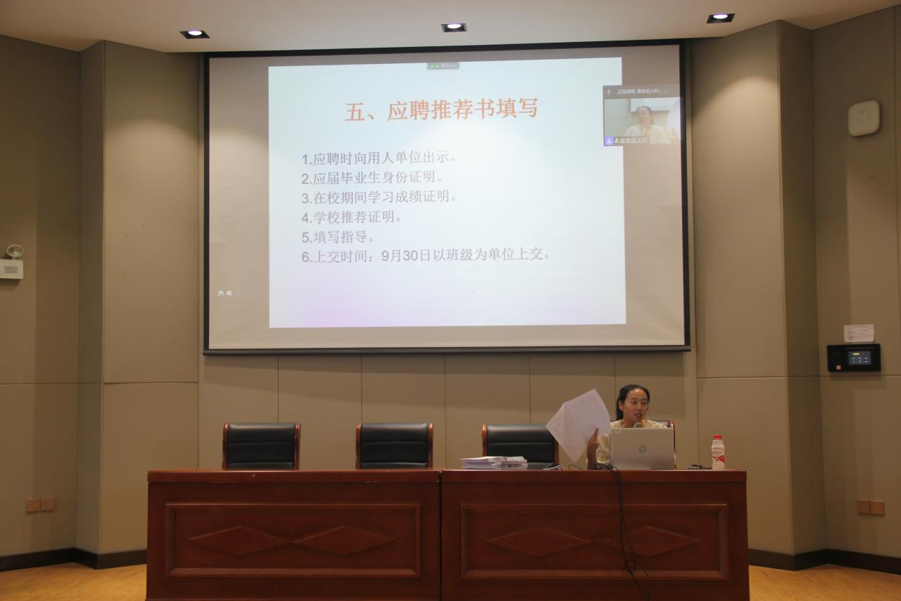 紧接着,钱璐老师就2022届毕业生即将面临的毕业就业问题作出指导。老师指出:首先要注意毕业自查,临近毕业,一要修满学分,二要做好学位申请工作;其次,要做好最后一年的工作安排,做到有条不紊。会上,钱璐老师还现场指导应聘推荐书的填写。