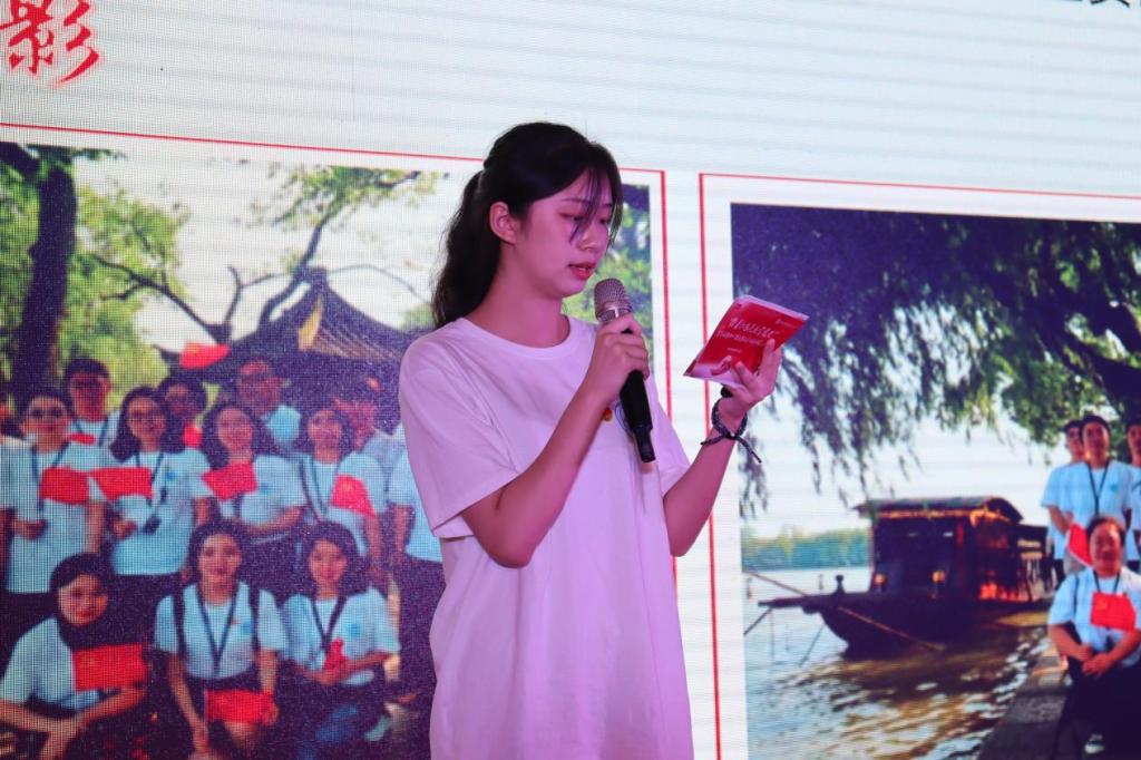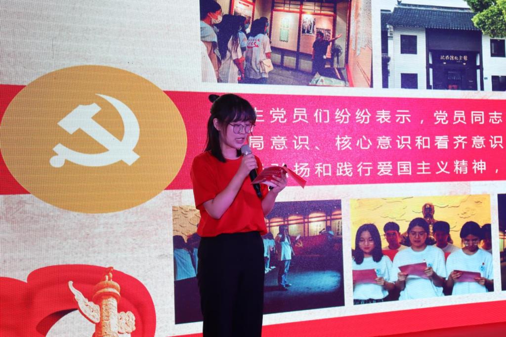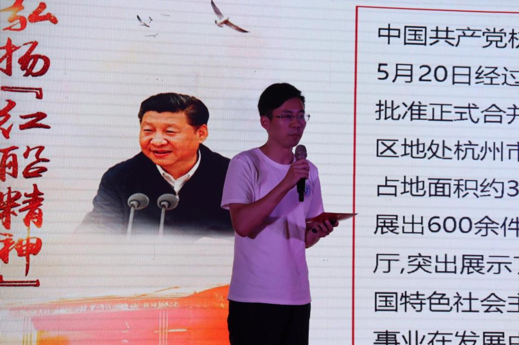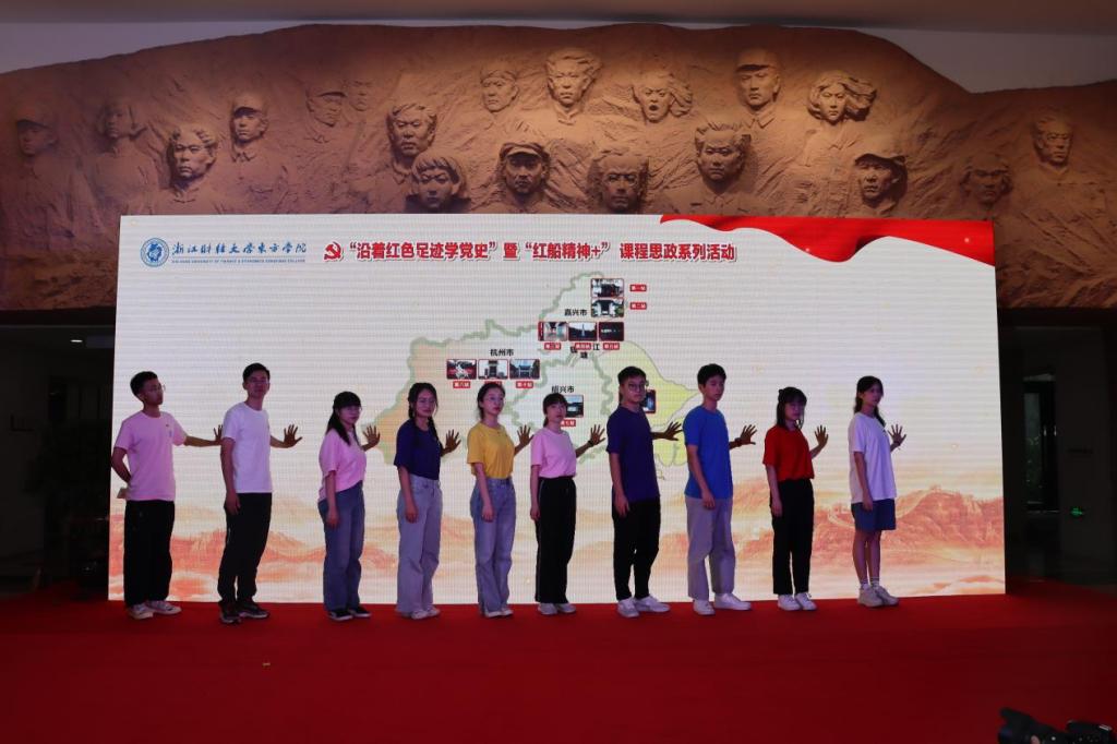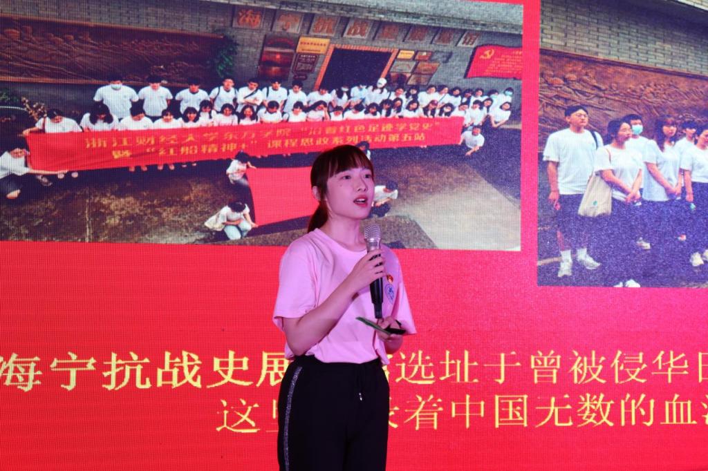 “沿着红色足迹学党史”暨“红船精神+”课程思政系列活动前后共赴十站,站站遍布风霜,站站满是荣光。第一站嘉兴南湖,财税学院党总支,宣讲人徐怡冉,她向我们讲述了“红船精神”,感悟那份非凡的初心和使命;第二站沈钧儒纪念馆,会计学院党总支,宣讲人叶轶欢,她向我们介绍了沈钧儒先生的个人介绍和青年学生党员的所思所想;第三站长安镇“红色记忆之路”国防教育基地,工商学院党总支陈泳豪,他向我们表达了坚定理想信念,传承红色基因的誓词;第四站海宁革命烈士纪念馆,联合党总支,宣讲人罗家栋,他向我们介绍了海宁革命烈士陵园纪念碑的结构,坚定了入党信念。第五站海宁抗战史展览馆,外国语学院党总支,宣讲人徐馨,她向我们讲述了侵华日军血染和叶村的故事,教育我们荷叶清清,挺傲骨而不折,出淤泥而洁净;第六站四明山抗日根据地旧址群,金融与经贸学院党总支,宣讲人柯雨佳,她向我们介绍了四明山抗日根据地的来源以及翁大花的故事;第七站绍兴市周恩来祖居及纪念馆,信息学院党总支,宣讲人王雪入,她向我们详细介绍了周恩来祖居和鲁迅故里;第八站杭州革命烈士纪念馆,文化传播与设计学院党总支,宣讲人宋洁茹,她让我们体会到了如今幸福生活来之不易,懂得了生命真正的意义,也懂得了自己身上所肩负的责任。第九站中国共产党杭州历史馆、五四宪法馆,他带我们重温了杭州人民在中国共产党的领导下为争取国家独立和民族解放的艰辛;第十站,浙江革命烈士纪念馆,法政学院党总支,宣讲人罗今,他向我们讲述了自己爷爷奶奶的故事,让我们铭记学习他们的无畏精神,方寸之间,荣光始现。最后,十位宣讲人一起,将手置于红色地图之上,点燃红色地图。