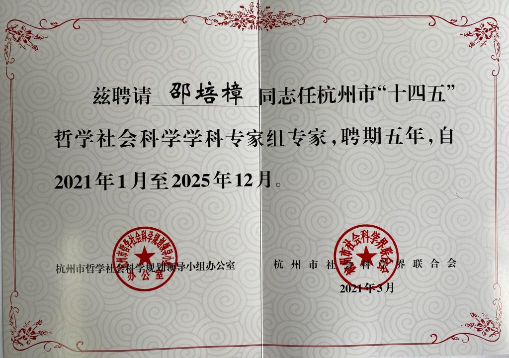 近日,根据杭州市哲学社会科学规划办公室、市社科联的杭社规[2021]3号文件,我院邵培樟教授受聘杭州市“十四五”哲学社会科学学科组专家。
