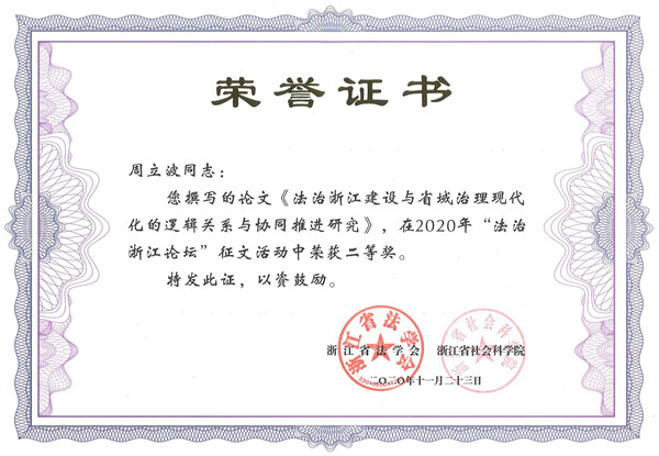 本次论坛的主题为“法治浙江建设与省域治理现代化”。自今年8月启动论坛征文活动以来,共收到征文673篇,征文紧扣论坛主题,从完善地方立法、优化营商环境、建设法治政府、促进司法公正、创新社会治理等角度切入,研究探讨法治浙江建设中的理论、制度与实践问题,对于在法治轨道上推进省域治理现代化,进一步深化平安浙江、法治浙江建设具有重要的参考意义。经组织专家评审,共评选出论文一等奖5篇,二等奖10篇,三等奖15篇,优秀奖30篇。我院周立波老师撰写的《法治浙江建设与省域治理现代化的逻辑关系与协同推进研究》一文荣获二等奖。