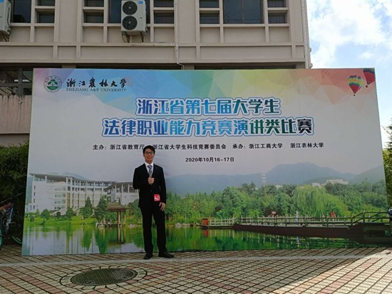 10月16-17日,由浙江省教育厅、浙江省大学生科技竞赛委员会主办,杭州农林大学、浙江工商大学承办的浙江省第七届大学生法律职业能力竞赛法律演讲比赛在浙江农林大学东湖校区举行。我院入围决赛的张承霖同学(指导老师:邵培樟)由周立波老师带队参加了此次比赛,与来自全省各地28所高校近150名法科学生进行角逐,并凭着充足的准备和良好的发挥,收获佳绩。