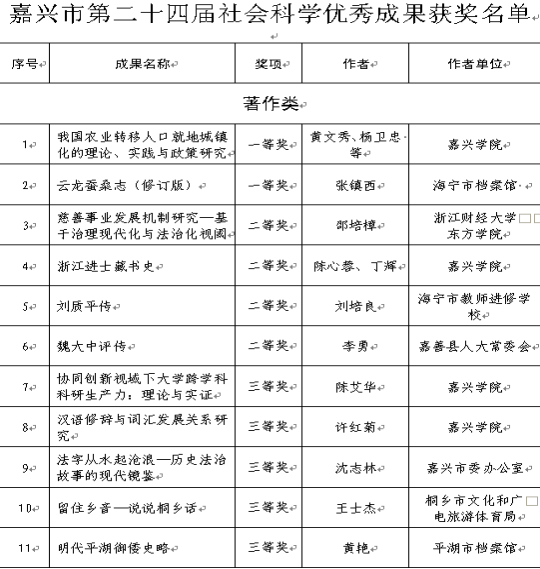 近日,根据嘉政办发〔2019〕42号文件,我院慈善法治与社会治理学科方向负责人邵培樟老师的学术专著《慈善事业发展机制研究─基于治理现代化与法治化视阈》(中国政法大学出版社,2018年11月版)荣获嘉兴市第二十四届社会科学优秀成果二等奖。据悉,嘉兴市第二十四届社会科学优秀成果经市社会科学优秀成果评审委员会审定,评出一等奖、二等奖、三等奖共48项,其中著作类11项,论文类37项。