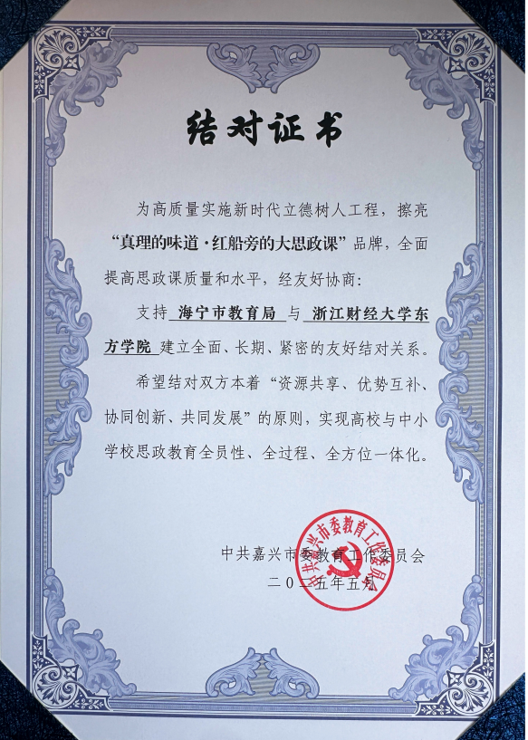 活动中,叶颖蕊代表东方学院马克思主义学院与海宁市教育局签署结对协议。双方将围绕大中小学思政课一体化建设,在课程共建、师资互聘、实践基地共享、课题研究等领域展开深度合作。尤其在“大思政课”实践教学基地建设方面,双方将整合海宁本土的历史文化资源、乡村振兴示范场景与学院的理论研究优势,共同开发兼具地域特色与时代内涵的思政课实践教学项目。此次与海宁市教育局结对,是学院落实习近平总书记“大思政课”重要指示精神的具体行动。未来,学院将以结对共建为契机,一方面发挥高校在思政理论研究、师资培训等方面的优势,助力基础教育阶段思政课提质增效;另一方面主动对接地方需求,将鲜活素材融入思政课堂,推动思政教育从“单向传递”向“多元互动”转变,真正实现大中小学思政课同频共振、螺旋上升。