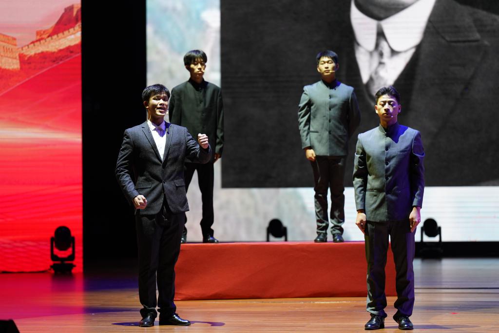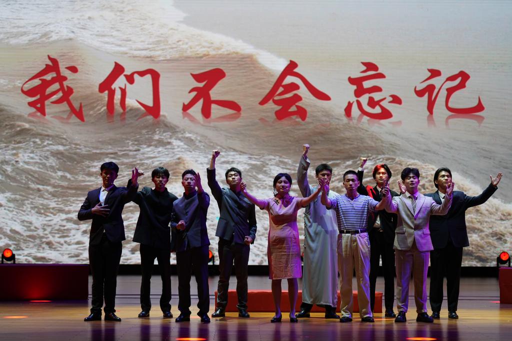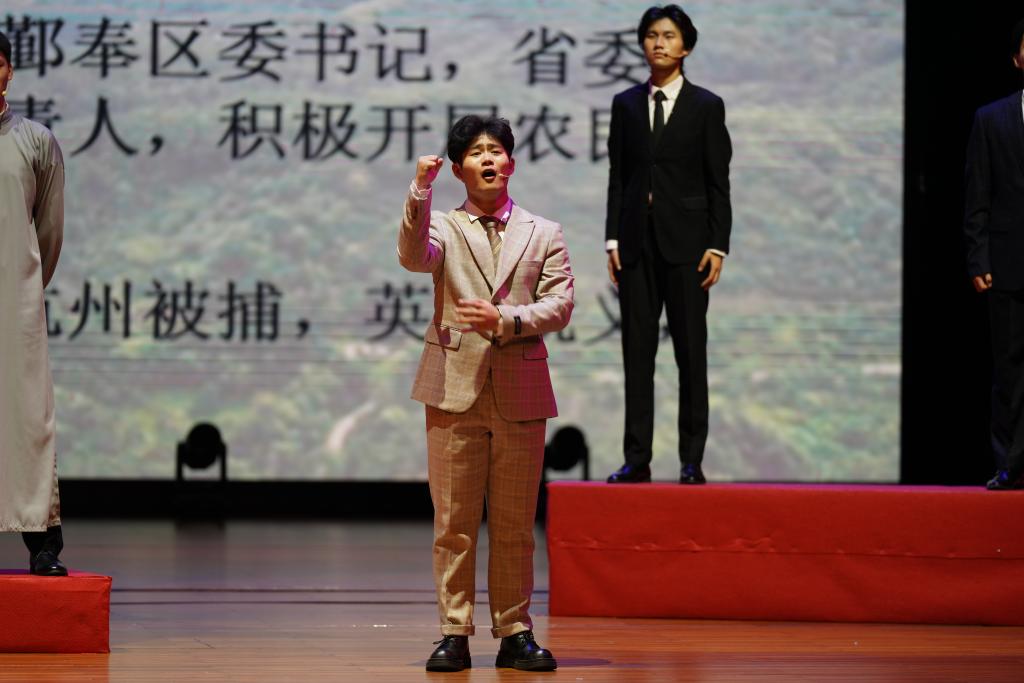 情景朗诵《我们不会忘记》演绎了十位浙江籍烈士朱枫、徐英、王伟、刘英、张秋人、金贯真、王家谟、邵飘萍、俞秀松、卓兰芳的英雄瞬间,生动诠释了伟大抗战精神始终激励着共产党人为“中国人民谋幸福、为中华民族谋复兴”。当十位英烈的身影从历史的雾霭中缓缓走来,他们的名字,如镌刻在时光长河中的丰碑,熠熠生辉。台下的听众,如置身于历史的漩涡,被英烈们的热血与信念感染。随着卓兰芳的振臂高呼,《国际歌》的旋律在现场回荡,歌声震天,现场掌声雷动,仿佛与窗外的山河共鸣。这一刻,历史与现实交汇,英烈们的精神穿越了时空的长河,与当代青年的心跳同频共振。