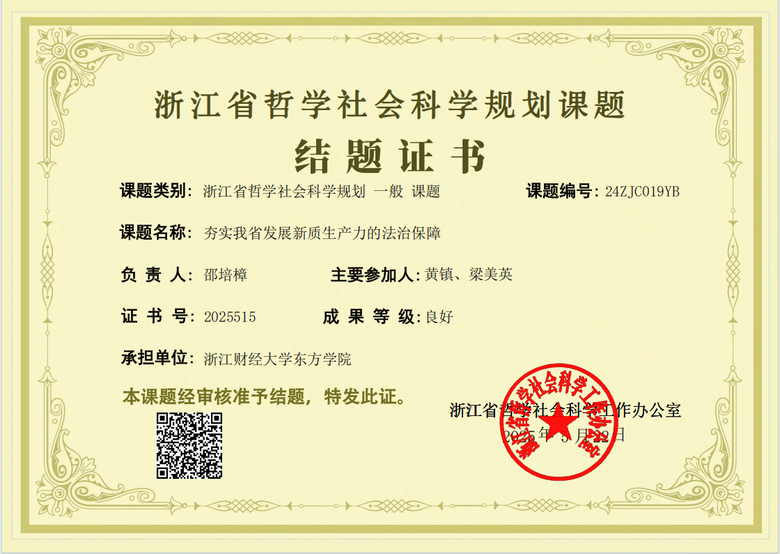 近日,根据浙江省哲学社会科学办公室公告,我院邵培樟教授主持、梁美英副教授参与的2024年度浙江省哲学社会科学规划课题《夯实我省发展新质生产力的法治保障》经评审,顺利结题,成果等级获评良好。