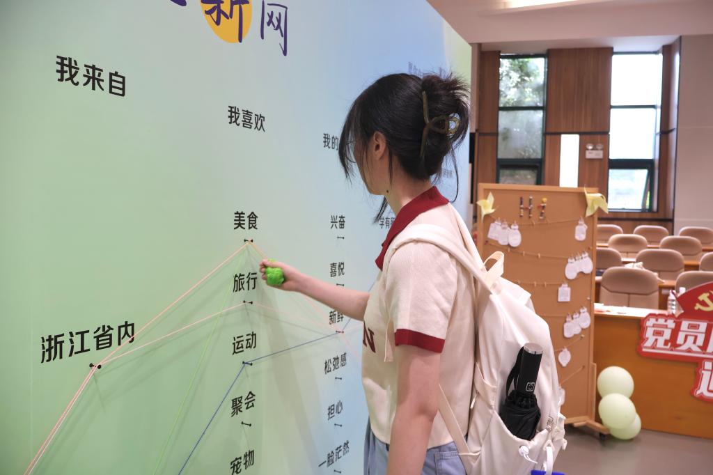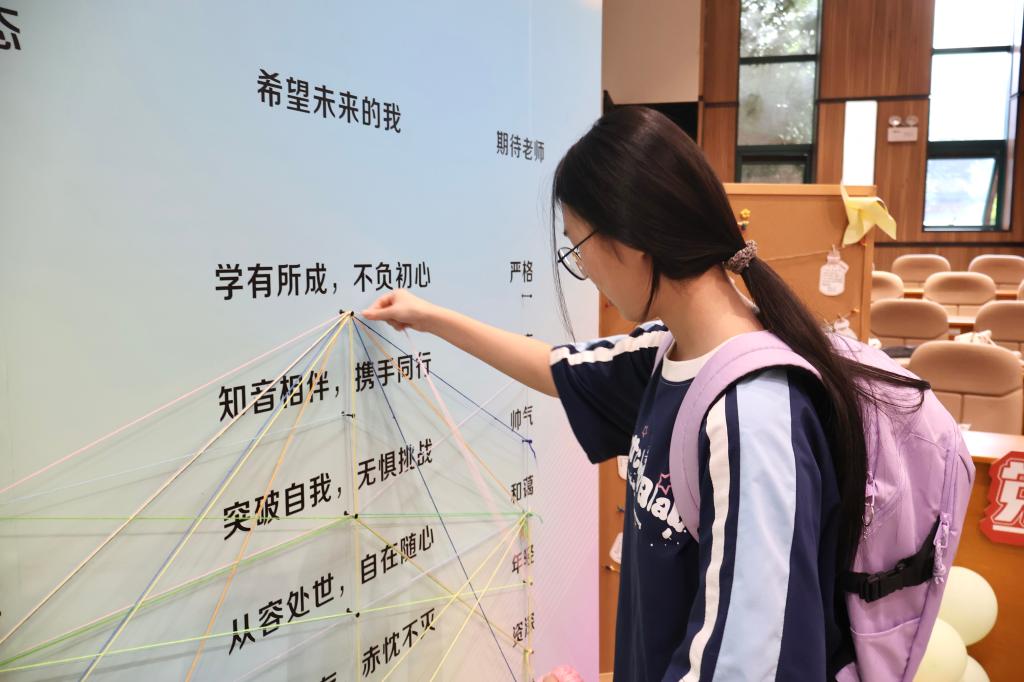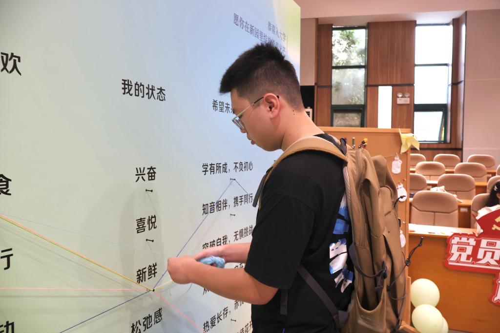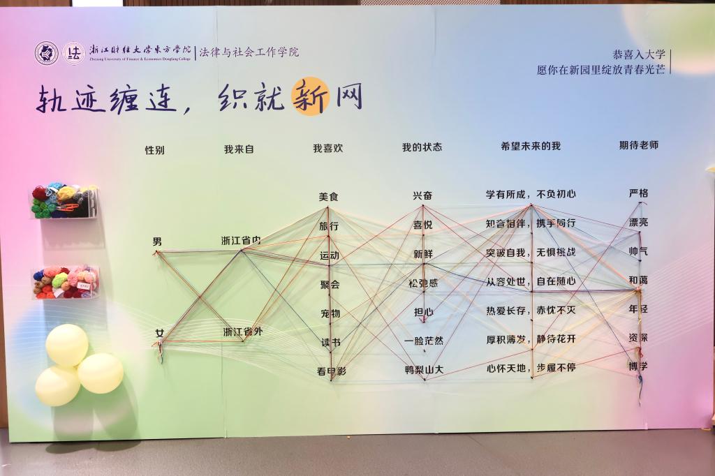 5J101进门处设有缠线签到板,签到板上清晰标注着“入学状态”“未来期许”等多元选项。新生们循着自己的心意,择取对应选项缠绕丝线,多彩丝线绘就独特轨迹,青春梦想与同窗情谊在此刻联结,最终交织成2025级新生专属交际网。