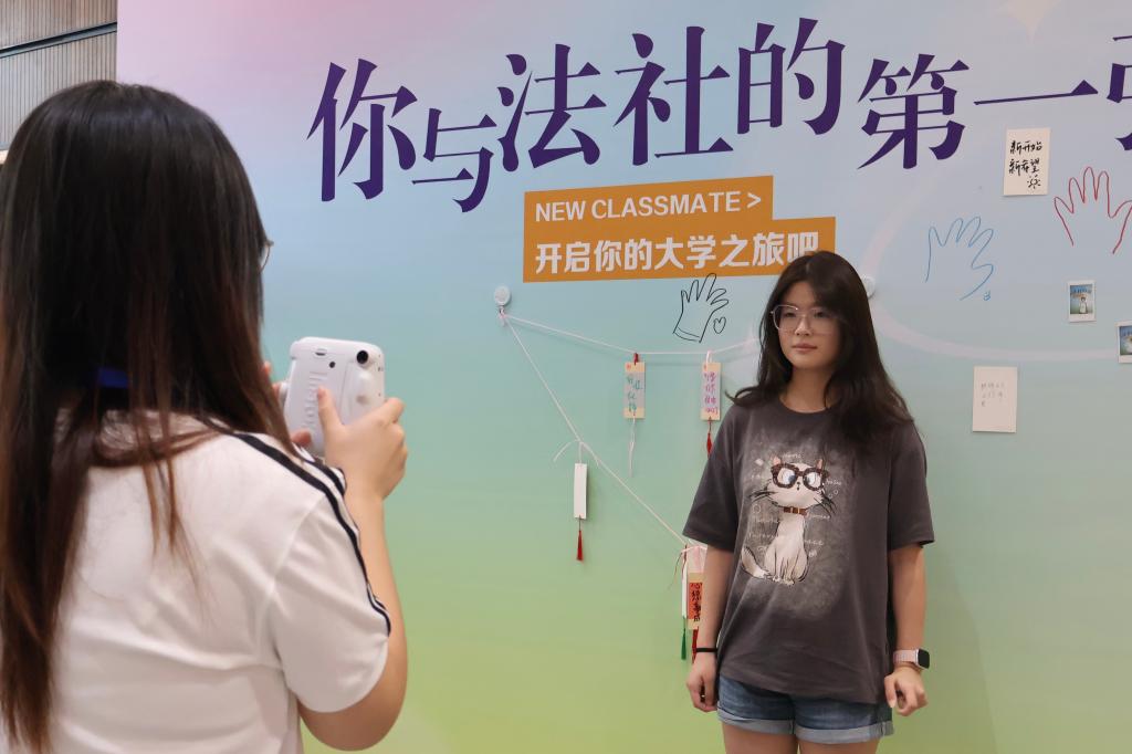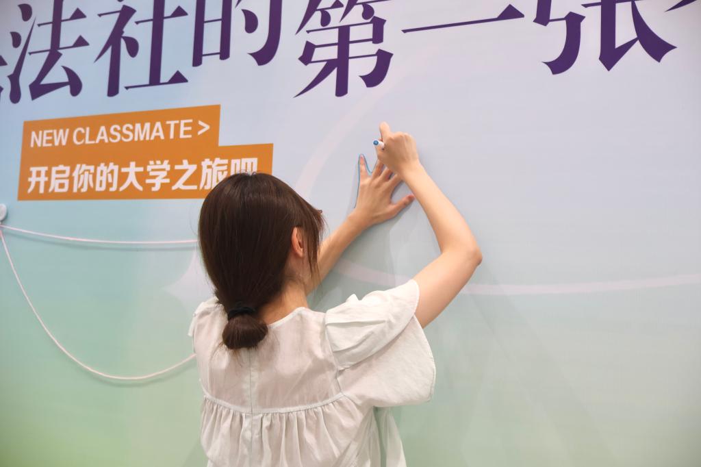 报到处的定制大转盘备受新生青睐。新生完成报到后,在班助与志愿者引导下参与“留下你在法社的第一张大合影”活动。转盘以艺术化的绘画形式,呈现出多样且充满趣味的内容,搭配拍立得合影、手绘等方式,让新生得以把入学时的初印象,定格在专属的大合影喷绘之上。活动结束后,新生可抽取写有“心想事成”等祝福语的签纸,兑换对应的精美小礼物。
