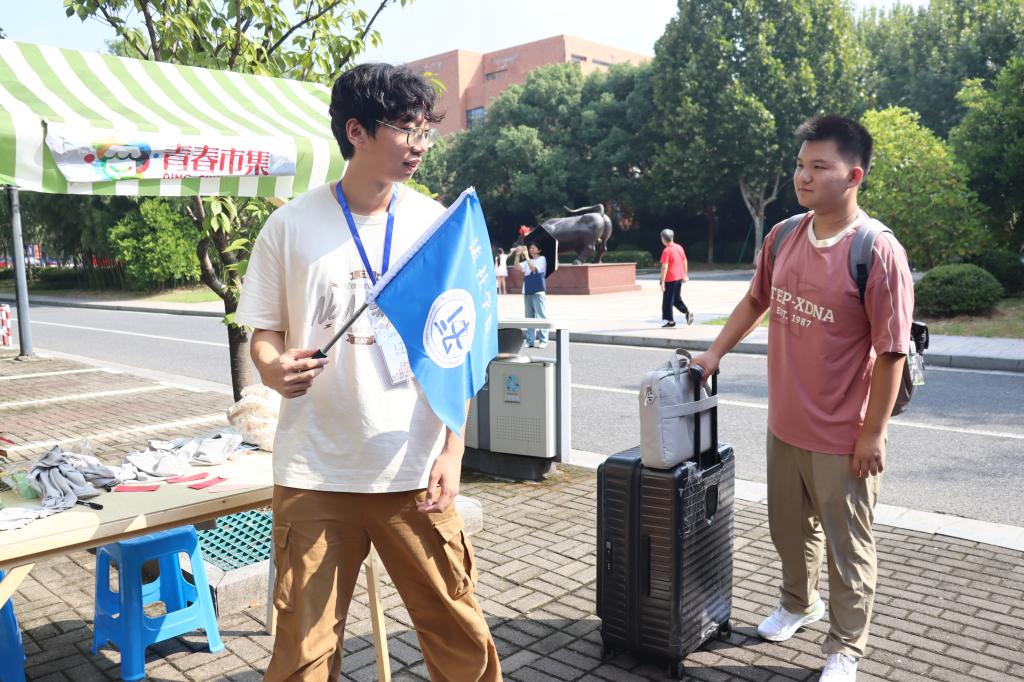 学校门口、报到现场、绿荫道上、宿舍楼下,迎新志愿者们高举法社“导游旗”,化身“活地图”,从校门到教学楼报到点,笑容满面地迎接每一位新生,沿途细细讲解校园建筑的布局与功能;待新生完成报到后,志愿者们又主动接过沉甸甸的行李,陪伴新生和家长从教学楼走向宿舍,为新生报到筑牢保障;同时,学院以党建为引领,在报到点设置党员先锋岗暖心帮助点,为报到新生提供饮水、避暑用品等,传递贴心关怀。