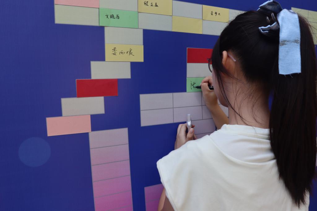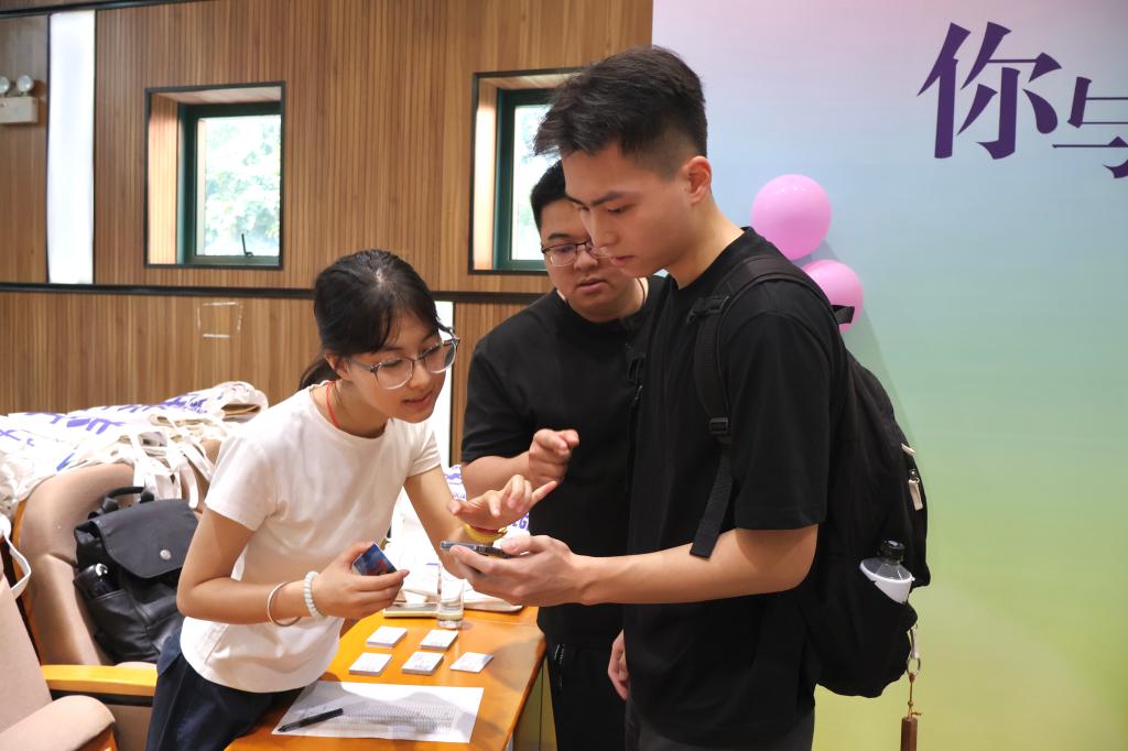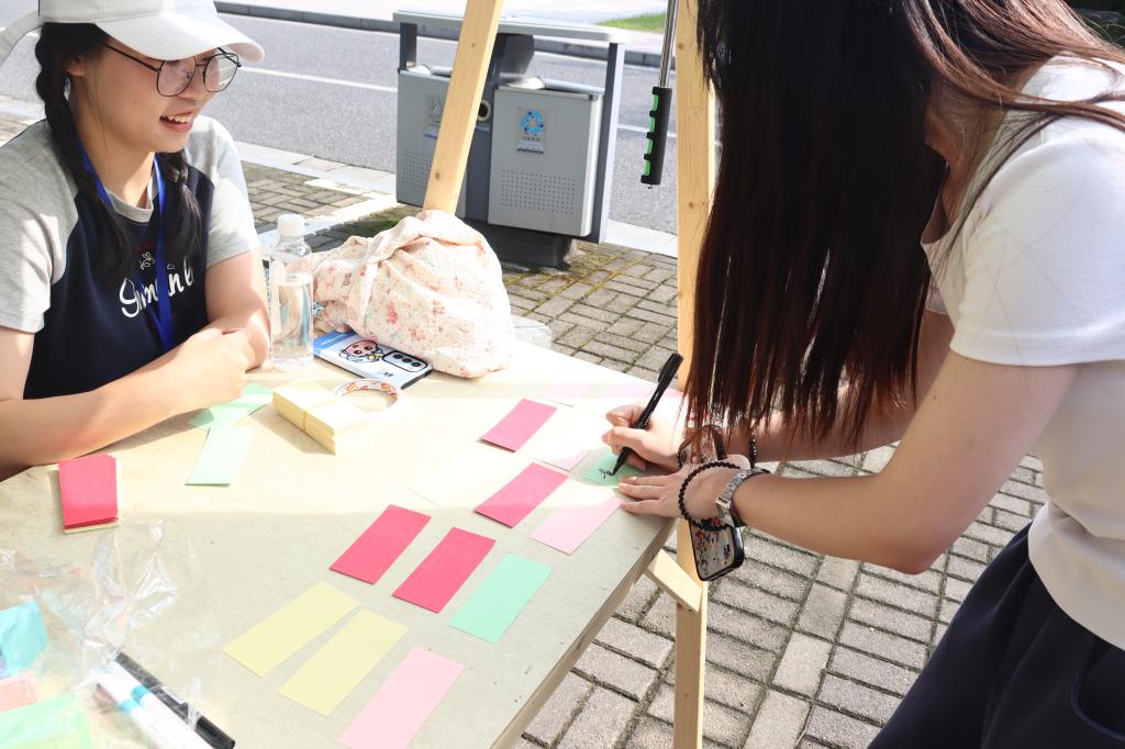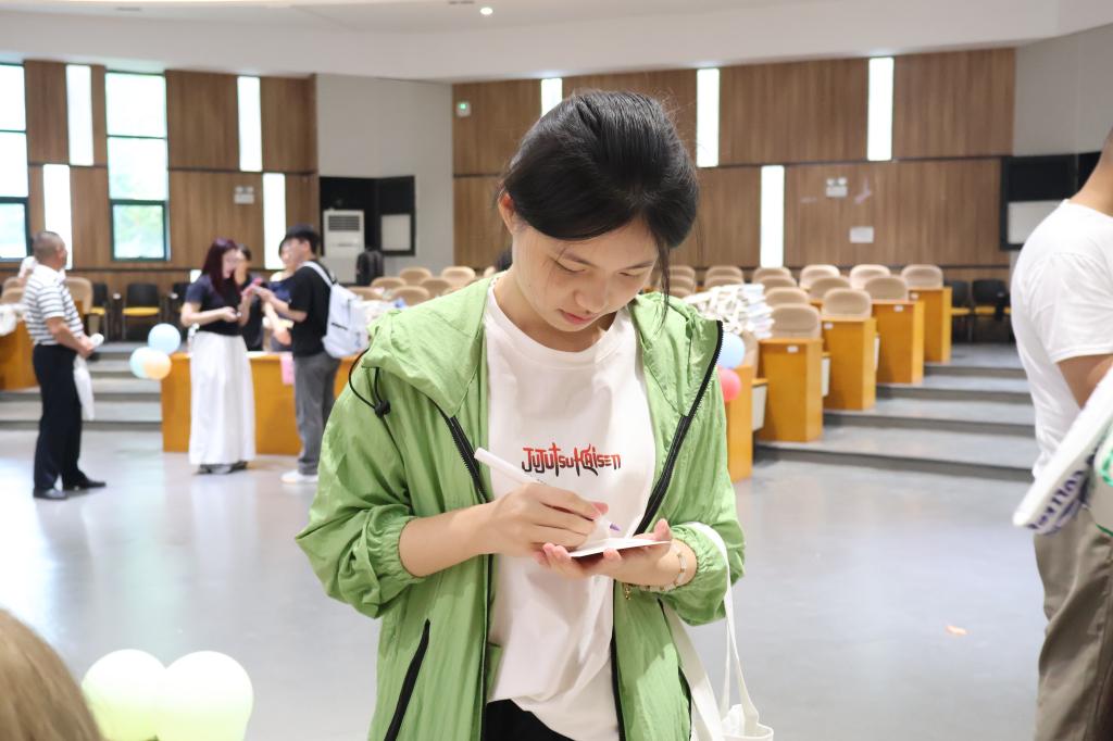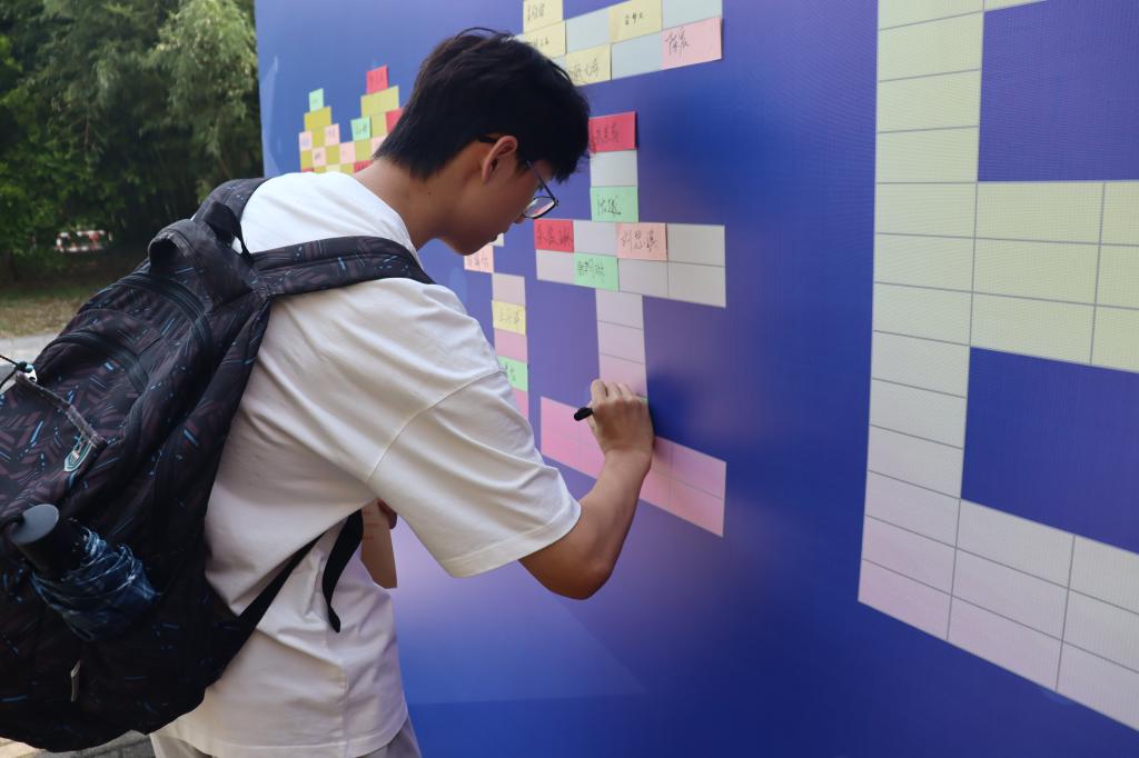 5J东门处设置了立体大喷绘,“热烈欢迎2025级新生”是喷绘上最动人的问候,新生在卡纸上签下名字,拼凑起“爱在E起”独特的姓名墙,落笔瞬间,与学院的第一份情感联结就此建立,此后的校园生活必将如光奔涌,盈满期许。