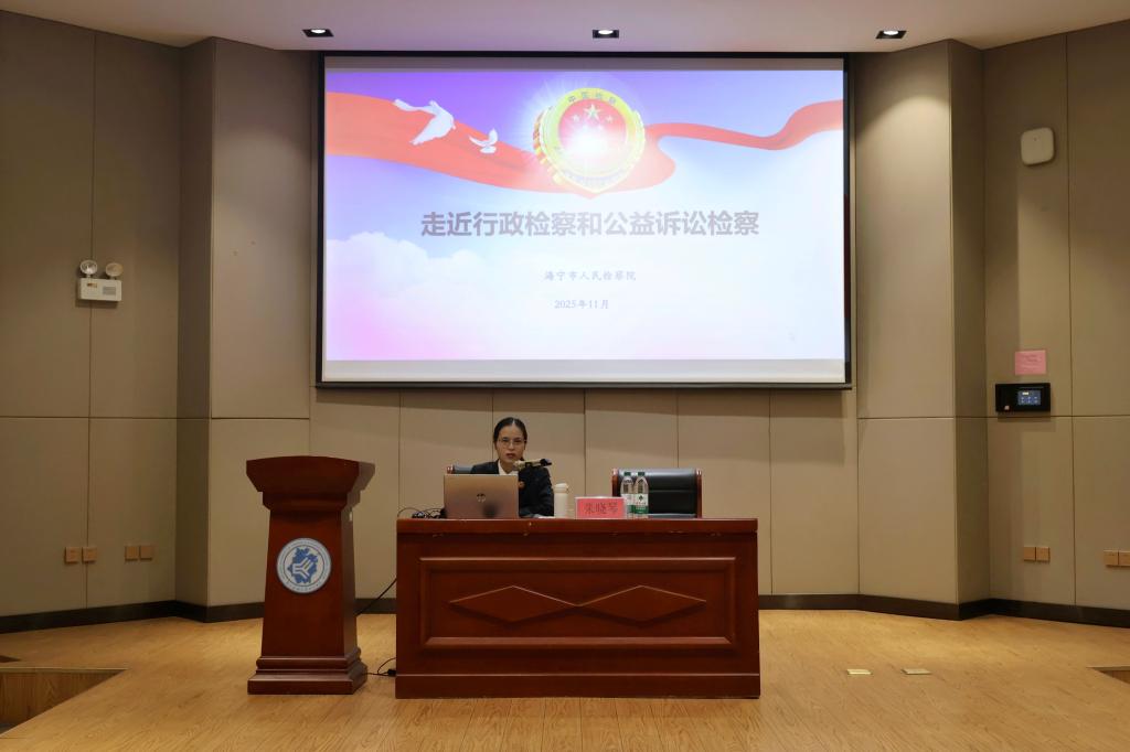 11月4日下午,法社学院诚邀海宁市人民检察院检察委员会委员朱晓琴,为我院新生带来一场“走进检察公益诉讼”主题讲座。本次讲座于5J-101举行,由法学系主任陈昱老师主持,全体2025级法学专业新生共同参与。