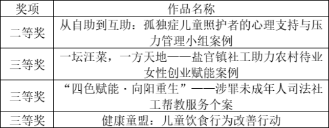 在社会工作案例大赛的角逐中,我院学子提交的实务案例同样表现优异。《从自助到互助:孤独症儿童照护者的心理支持与压力管理小组案例》凭借扎实的实务操作与显著的服务成效荣获二等奖;《一坛汪菜,一方天地——盐官镇社工助力农村待业女性创业赋能案例》《“四色赋能·向阳重生”——涉罪未成年人司法社工帮教服务个案》《健康童盟:儿童饮食行为改善行动》三篇案例则斩获三等奖,这些案例聚焦孤独症照护者、农村待业女性、涉罪未成年人等不同群体需求,以专业的社工方法解决实际问题,为行业实务开展提供了鲜活的参考样本。