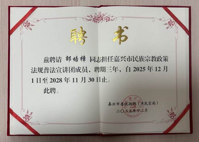 近日,法社学院院长邵培樟教授受嘉兴市委统战部、市民宗局委聘任,担任嘉兴市民族宗教政策法规普法宣讲团专家成员。