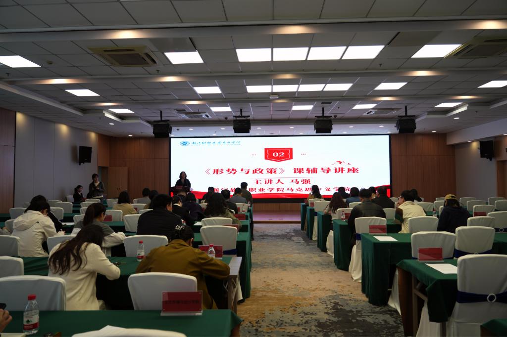 为深入学习贯彻党的二十届四中全会精神,落实“十五五”规划相关要求,持续提升《形势与政策》课教学质量与育人实效,2026年4月7日下午,我院召开2025-2026学年第二学期《形势与政策》课集体备课研讨会。院领导、党委宣传部负责人、马克思主义学院相关负责人、《形势与政策》课全体任课教师参会,研讨会特别邀请2025年浙江省高校《形势与政策》课教学展示比赛特等奖获得者浙江旅游职业学院马克思主义学院的马强老师作专题辅导分享。