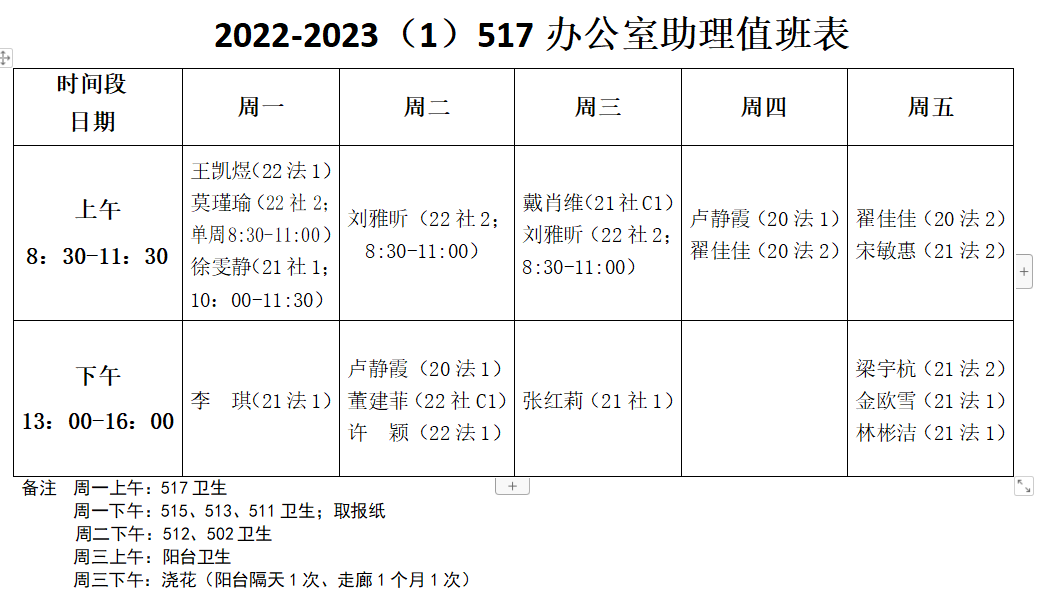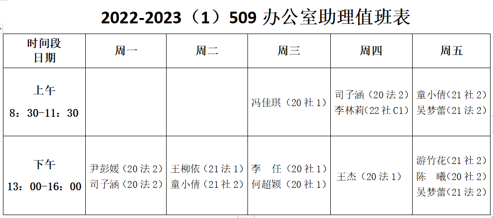 法政学院2022-2023学年第一学期学生助理值班表(更新)