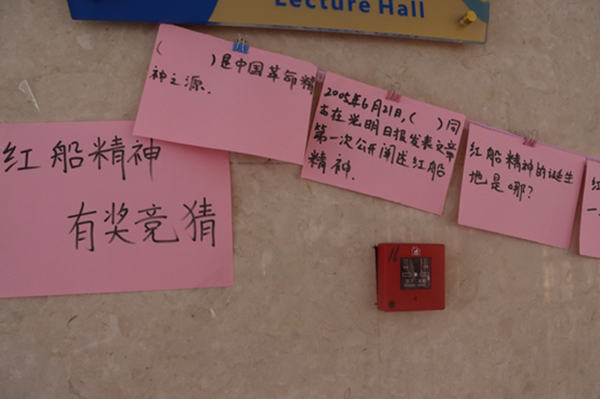 百年一瞬间,南湖红船依旧魅力十足。在本次讲座开始之前,组织了“红船精神·有奖竞猜”的小活动,在讲座入口处粘贴关于红船精神的相关问题,带领同学们回顾红船历史,重温红船精神,坚定理想信念,为进一步推动党的十九大精神学习宣传贯彻做出贡献。