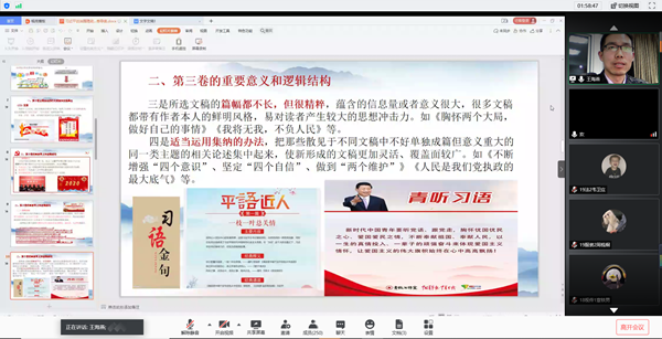 2020年11月20日19点,由我院马克思主义学院承办的思政大讲堂第九讲继续以线上形式举行。我院马克思主义学院邀请到武汉纺织大学马克思主义中国化教学部主任王海燕教授做题为《习近平谈治国理政》第三卷导读专题讲座。本次讲座由马克思主义学院思政教研部副主任吕欢主持,中共海宁市委宣传部、东方学院师生等约300人共同参与。
