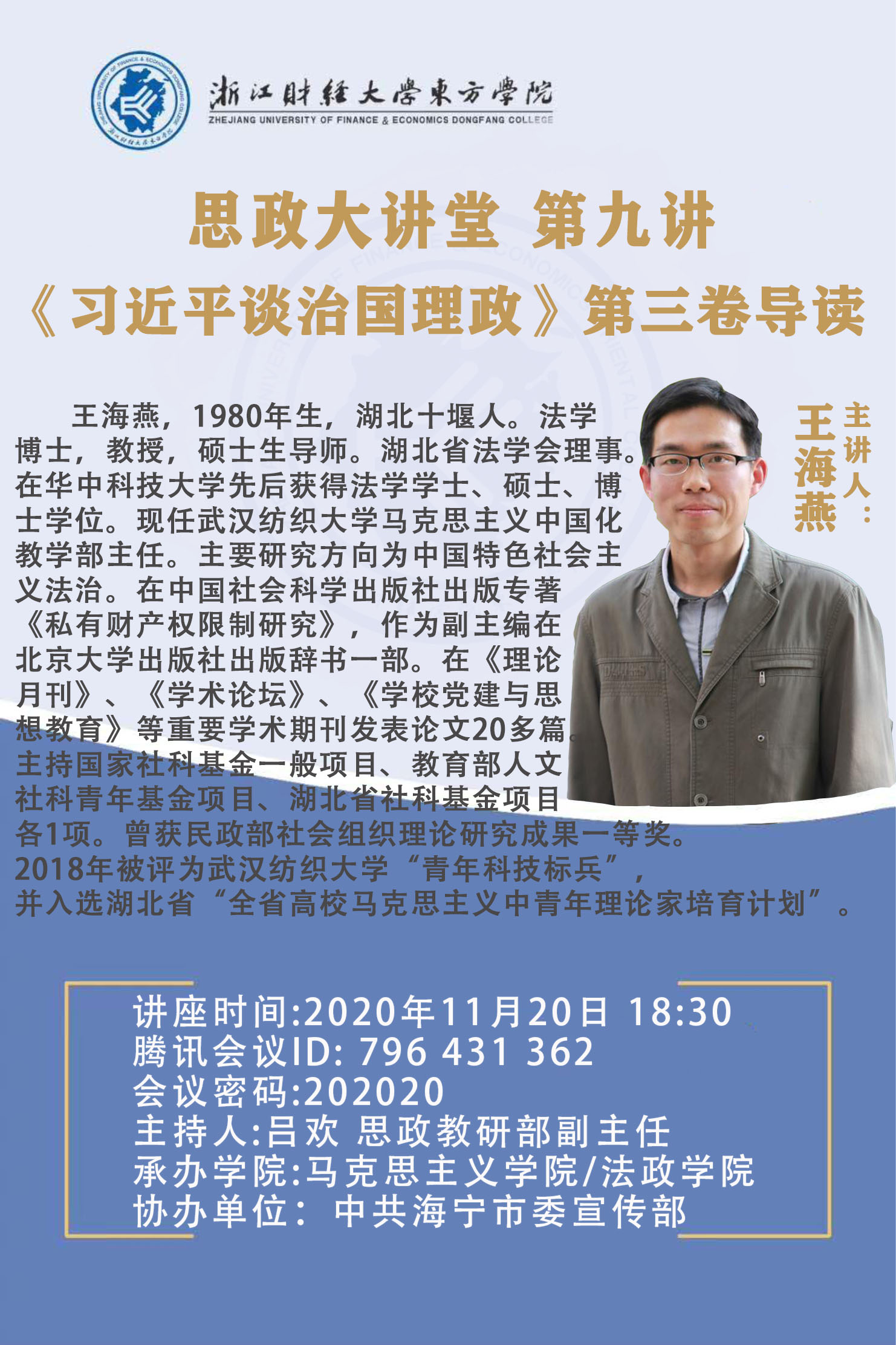 伟德victor1946马克思主义学院认真贯彻《中央宣传部、中央组织部关于认真组织学习〈习近平谈治国理政〉第三卷的通知》 ,将该著作作为高校师生思想政治教育的重要教材与重要内容。兹定于11月20日晚18:30邀请华中科技大学法学博士、湖北省高校马克思主义中青年理论家培育计划人选武汉纺织大学马克思主义中国化教研部王海燕教授在线导读。
