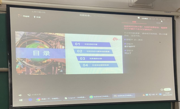 为切实提高学生实务能力培养,推进省级一流本科课程《社区社会工作综合实务》建设,12月10日,社会工作系特别邀请了全国百强社工机构嘉兴阳光家庭社工事务所副总干事周凝婕女士为19社工专业学生就“社区服务方案策划”进行实务经验分享与交流。考虑到疫情防护情况,此次“实务精英进课堂”以线上方式进行。